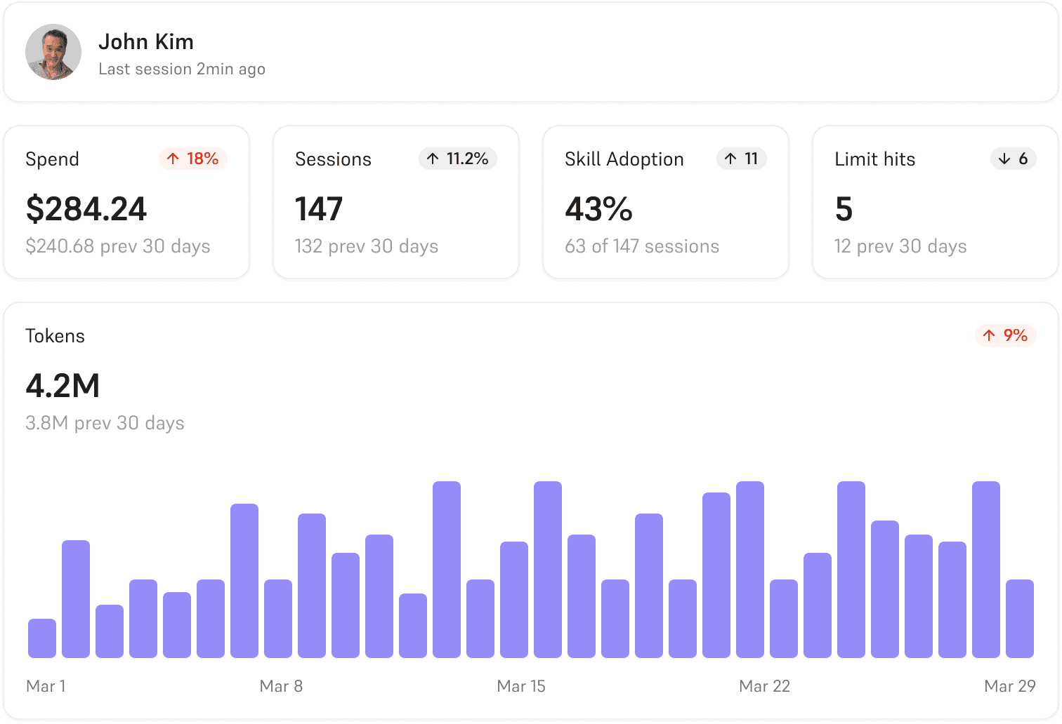 See any engineer's complete picture: every session they've run, what it cost, and which tools they rely on. Track spend over time, spot anomalies, and see whether they're actually using the Skills the team has built.